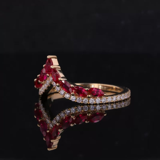• V-shaped ring with vibrant ruby gemstone and sparkling moissanite
