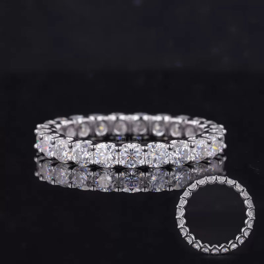 • Channel set full eternity band with round moissanite – secure setting and timeless circular brilliance