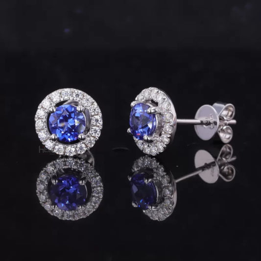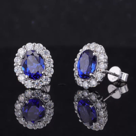 Blue Sapphire Oval Cut Gemstone With Round Cut Halo Studs Earring
