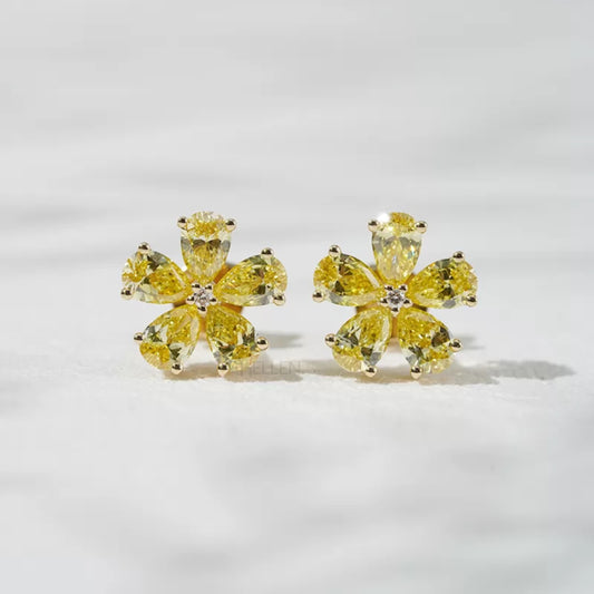 Pear Shaped Yellow Sapphire Flower Stud Earrings - 925 Silver