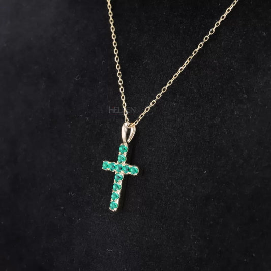 Green Round Cut Emerald Gemstone Cross Necklace for Gift