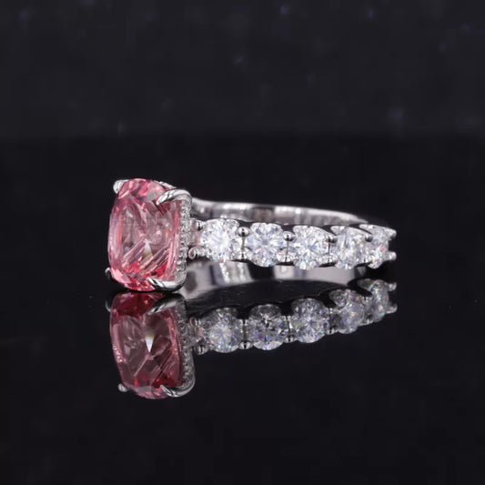 Pink Sapphire Elongated Cushion Cut Moissanite Pave Ring