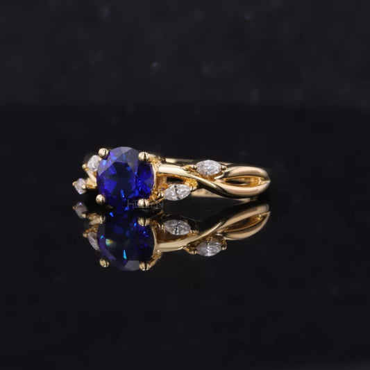 Blue Sapphire Round Cut Gemstone & Marquise Side Stone Ring