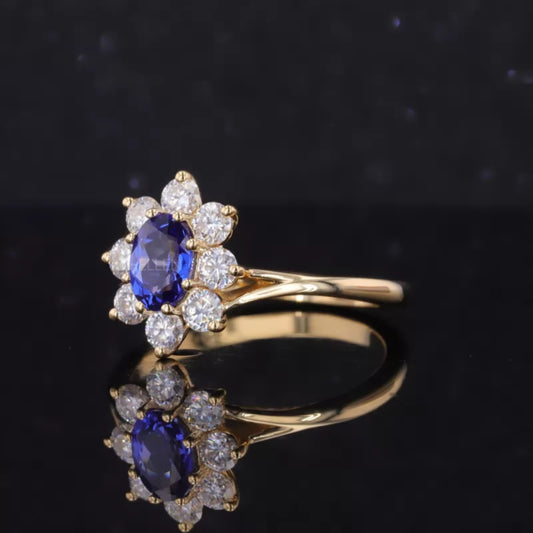 Blue Sapphire Oval Gemstone with Round Cut Halo Engagement Ring