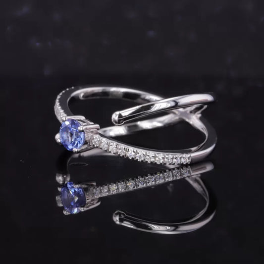 Blue Sapphire Round Cut Gemstone & Round Side Stone Crossover Ring