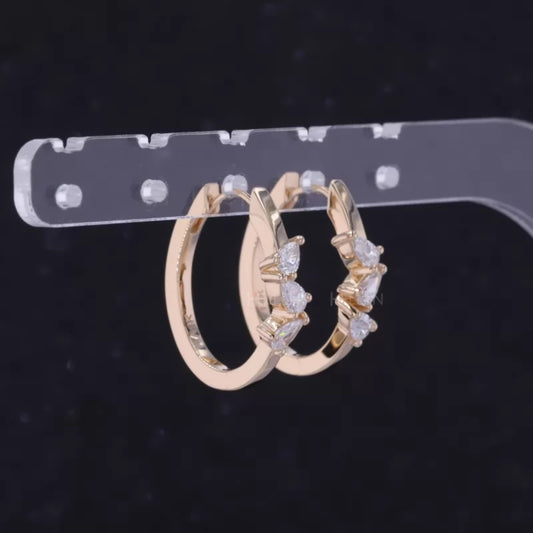 Three Stone Each Hoop Earring with Pear Cut Solitaire
