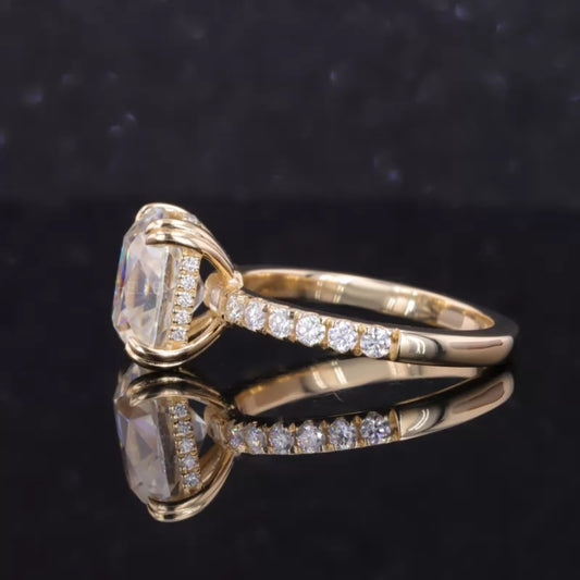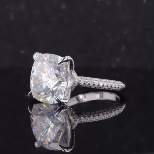10 Ct Cushion Cut Solitaire Moissanite Hidden Halo & Round Side Ring