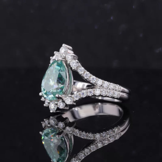 Blue-Green Pear & Round Moissanite Split Shank Engagement Ring