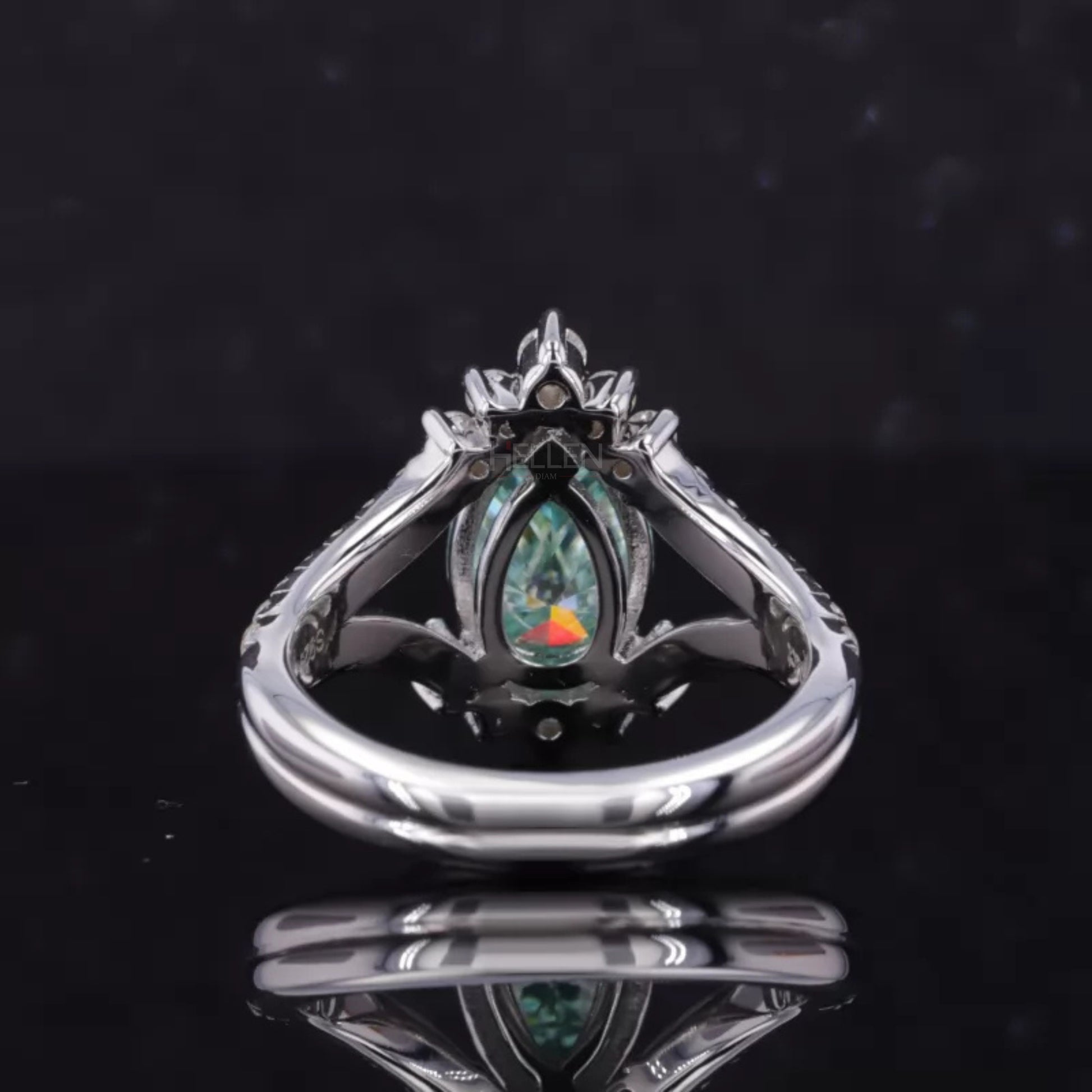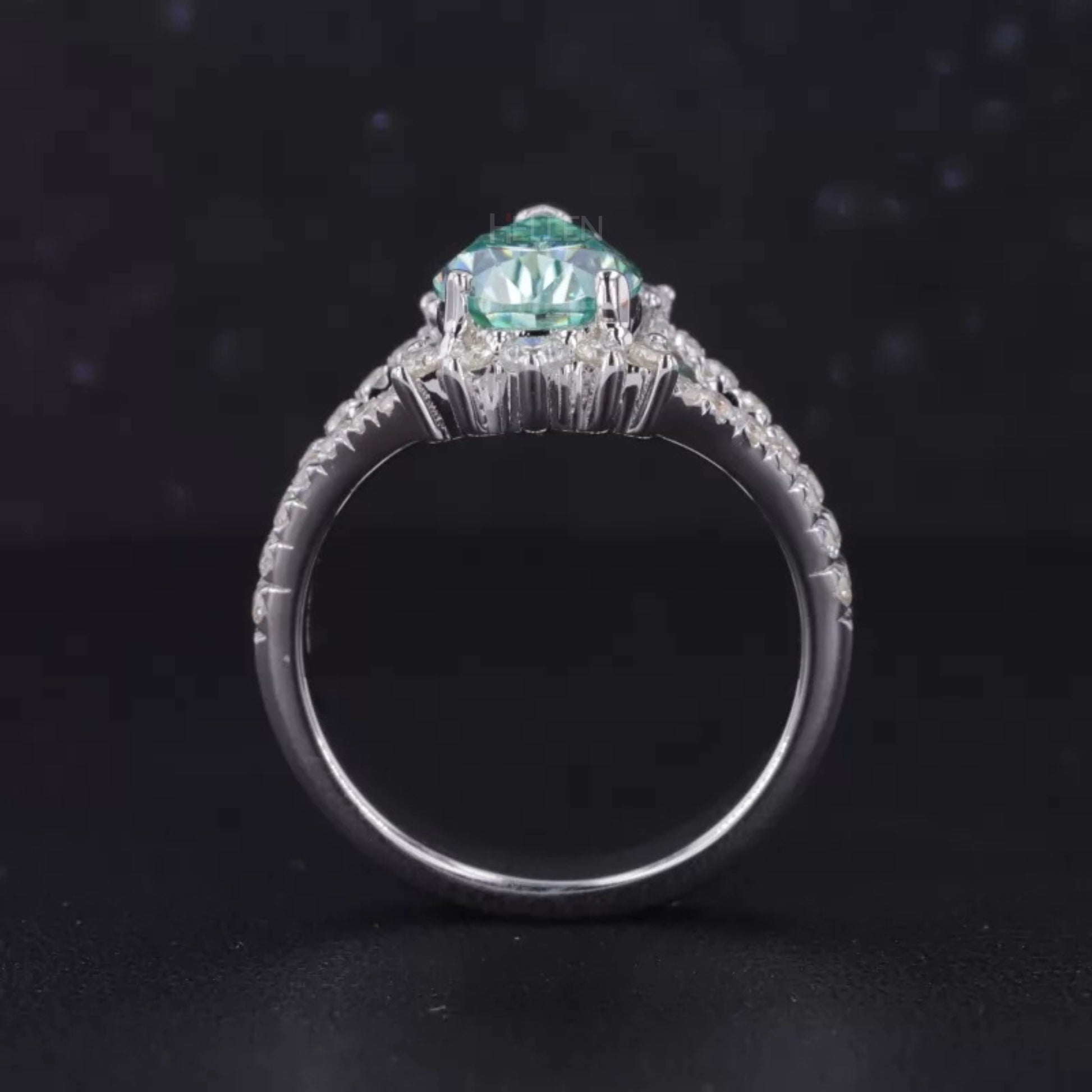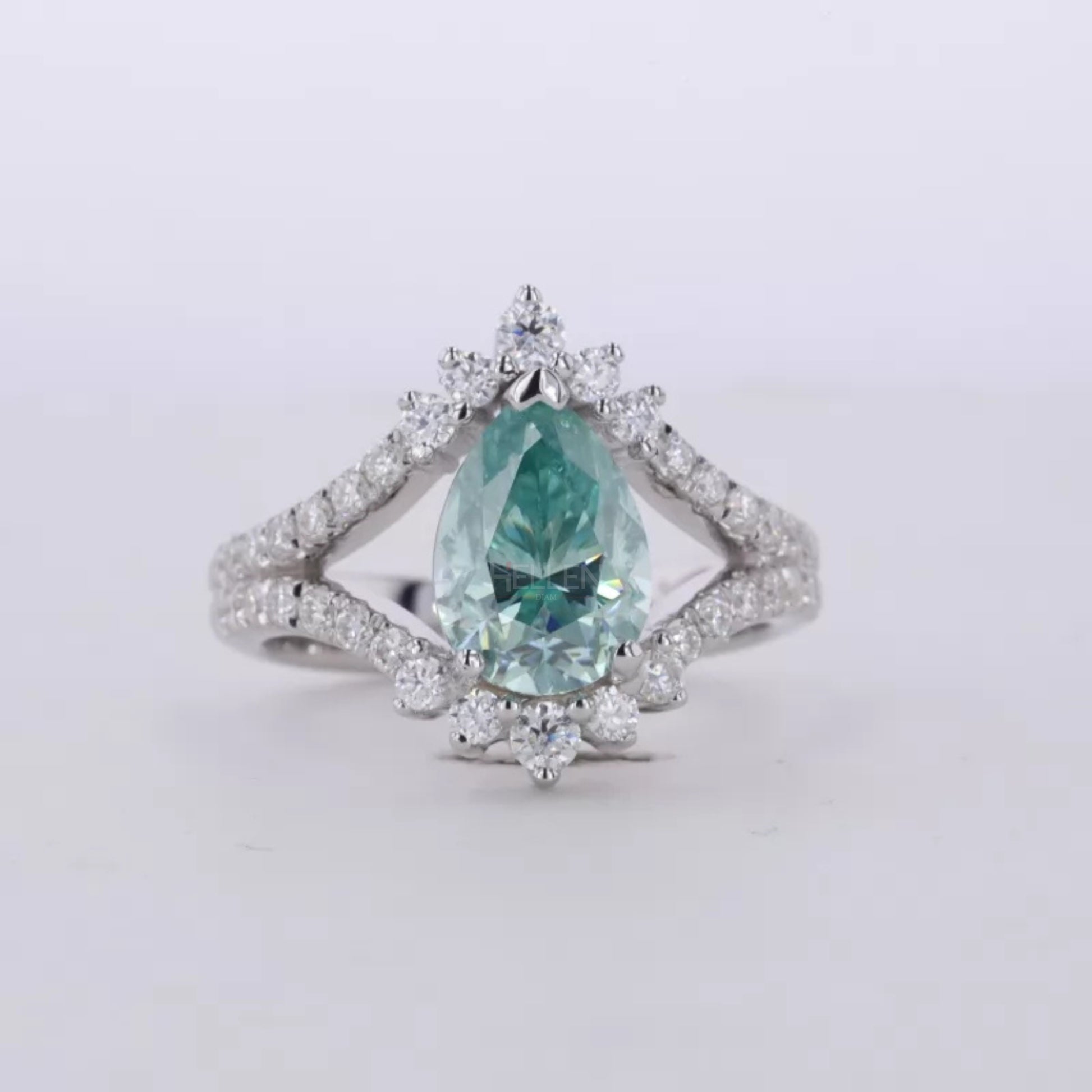Blue-Green Pear & Round Moissanite Split Shank Engagement Ring