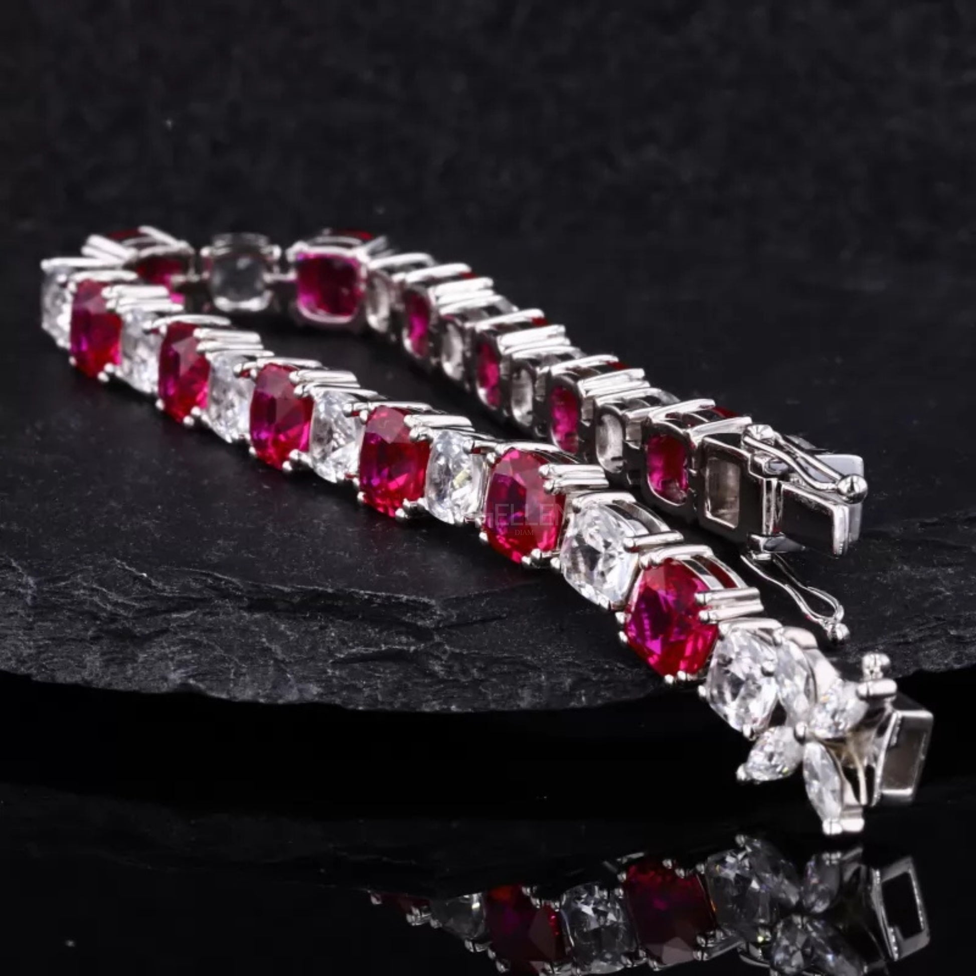 Cushion Cut Ruby & Moissanite Alternating Tennis Bracelet with Lock