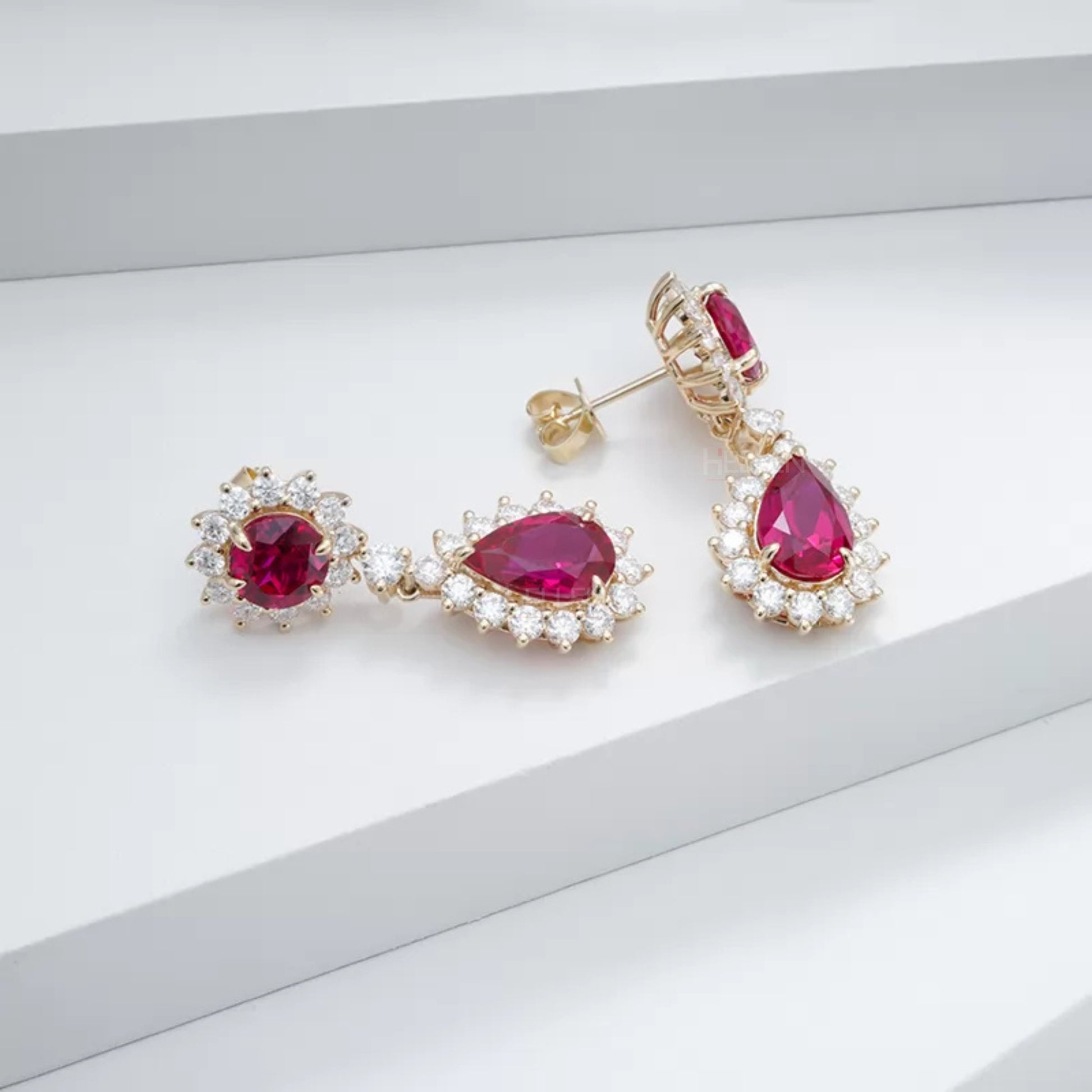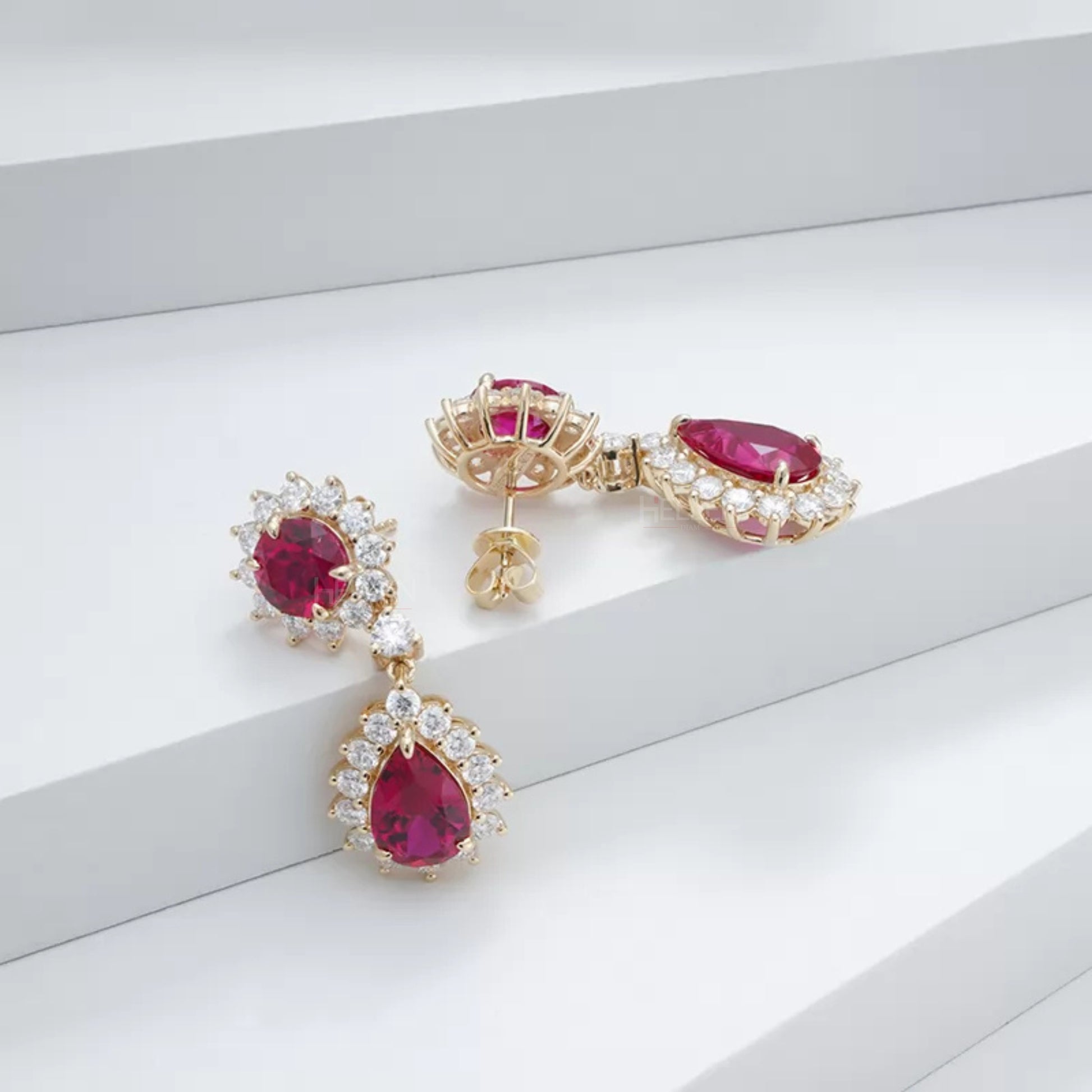 Stunning Ruby Halo Drop Earrings With Round Cut Moissanite